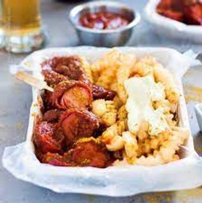 Currywurst is typically served with fries or bread rolls on the side. Enjoy!